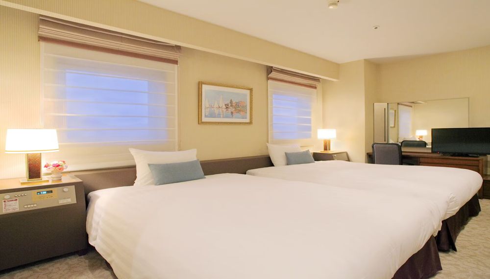 3名宿泊可能なツインルームがメインで、他に和洋室もあり。1部屋にミネラルウォーター2本サービス。