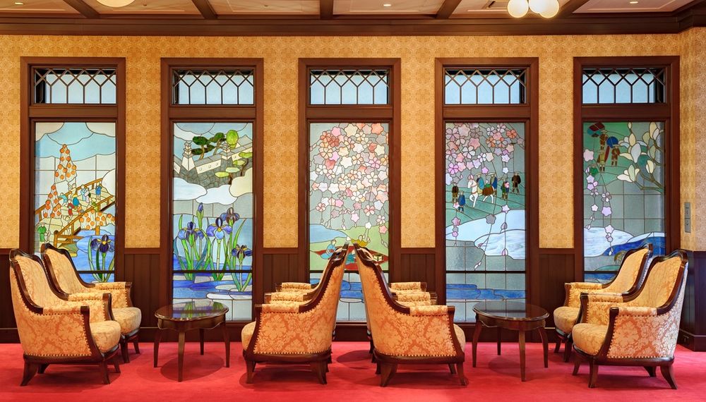 クラシックな空間の中、数多くの名品たちが揃っている様はまるで美術館。ロビースペースには、ステンドグラスの他に伝統工芸である金箔細工を使ったアート作品も並びます。